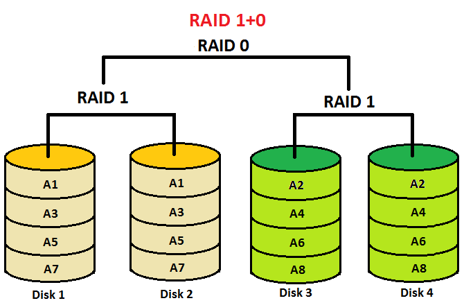 | Performs RAID 0 to strip data and RAID 1 to mirror | 100% disk capacity is not utilized as half is used for mirroring |