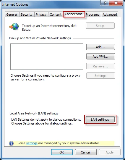 - Navigate to "Connections" TAB as seen below and open "LAN Settings"