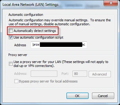 - Uncheck all other options if you are using any, and select "Automatically detect settings"