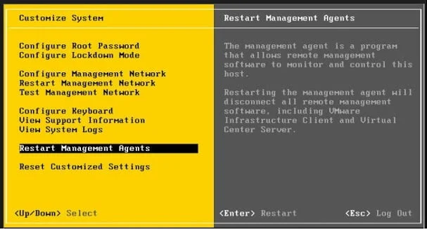 Restart Management agents in ESXi Using Direct Console User Interface (DCUI):
