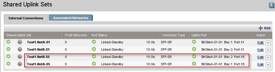 ->add uplinkport enc0:2:X5 UplinkSet=Test1-NetB-X5 Speed=Auto Role=Primary