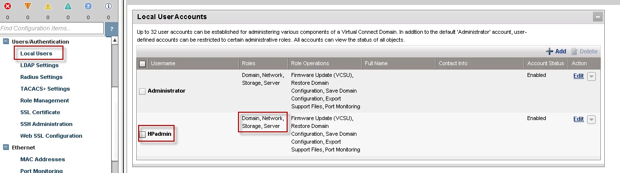 ->add user HPadmin Password=Blr#46713 Enabled=true Privileges=domain,network,storage,server