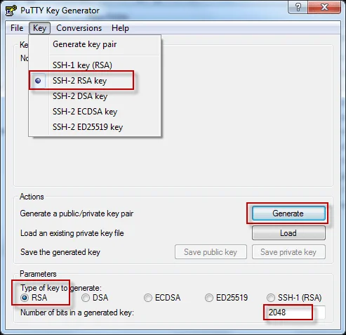 This tool is similar to Linux based ssh-keygen, next in the puttygen tool, select the key type and bit size which you would like use for the generated key.