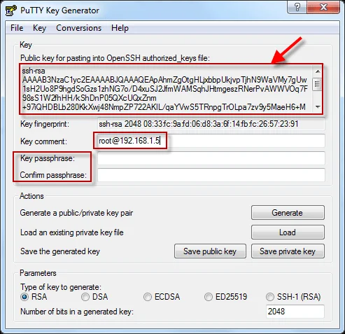The public key can be seen in the highlighted section, copy this and append the key to /root/.ssh/authorized_keys on 192.168.1.5 (my Linux box)