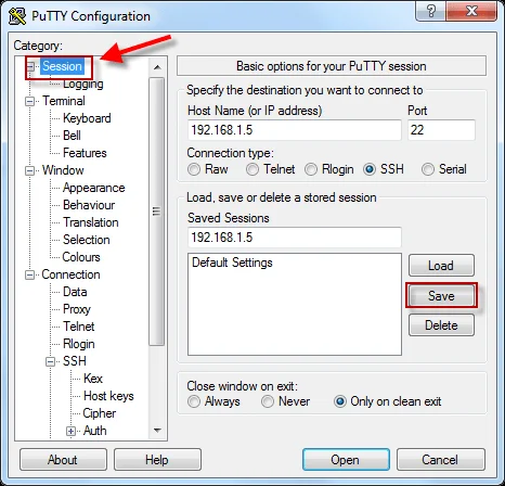 Next navigate back to "Session" as shown below and "save" the changes