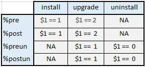 When scriptlets are called, they will be supplied with an argument. This argument, accessed via $1 (for shell scripts) is the number of packages of this name which will be left on the system when the action completes