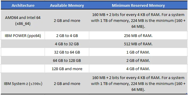 Another factor which influences the amount of memory to be reserved is the total amount of installed system memory. For example, on the x86_64 architecture, the amount of reserved memory is 160 MB + 2 bits for every 4 KB of RAM. On a system with 1 TB of total physical memory installed, this means 224 MB (160 MB + 64 MB).